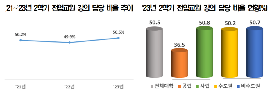 2023년 2학기 전임교원 강의 담당 비율은 50.5%로 2022년 2학기(49.9%)보다 0.6%p 증가했고, 강사의 강의 담당 비율은 18.1%로 2022년 2학기(19.3%) 보다 1.2%p 감소했다.