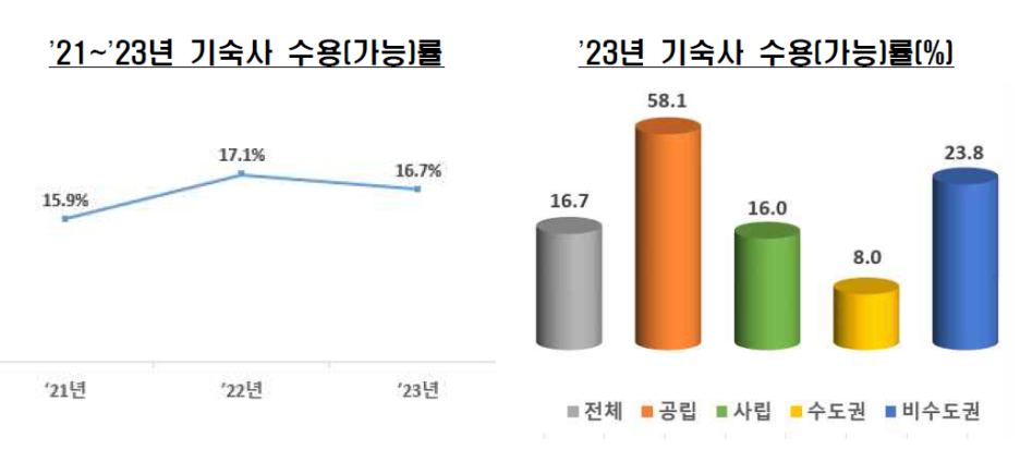 (기숙사 수용률) 2023년 기숙사 수용률은 16.7%로 2022년(17.1%)보다 0.4%p 감소했다.