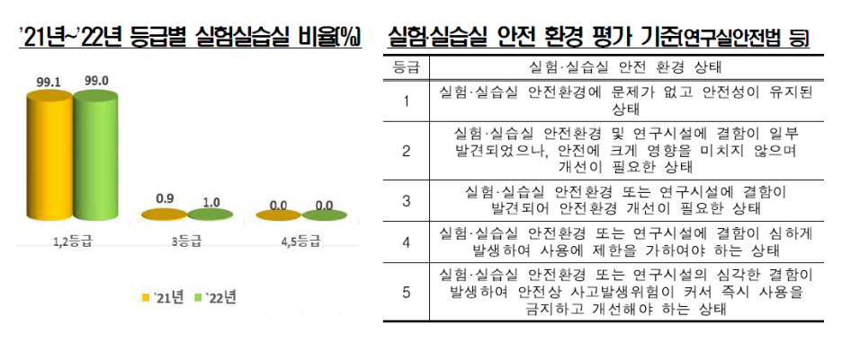 2022년 이공계 및 비이공계 분야 실험·실습실 안전 환경 평가 결과, 1·2등급은 99.0%로 전년 99.1%보다 0.1%p 감소했다.