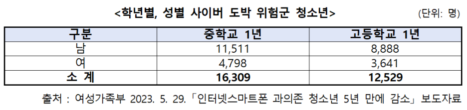 **(여성가족부) ’23. 4. 전국 중1・ 고1 학생 약 88만 명 대상 사이버 도박 진단조사 결과 사이버 도박 문제 위험군으로 조사된 청소년은 28,838명으로 확인