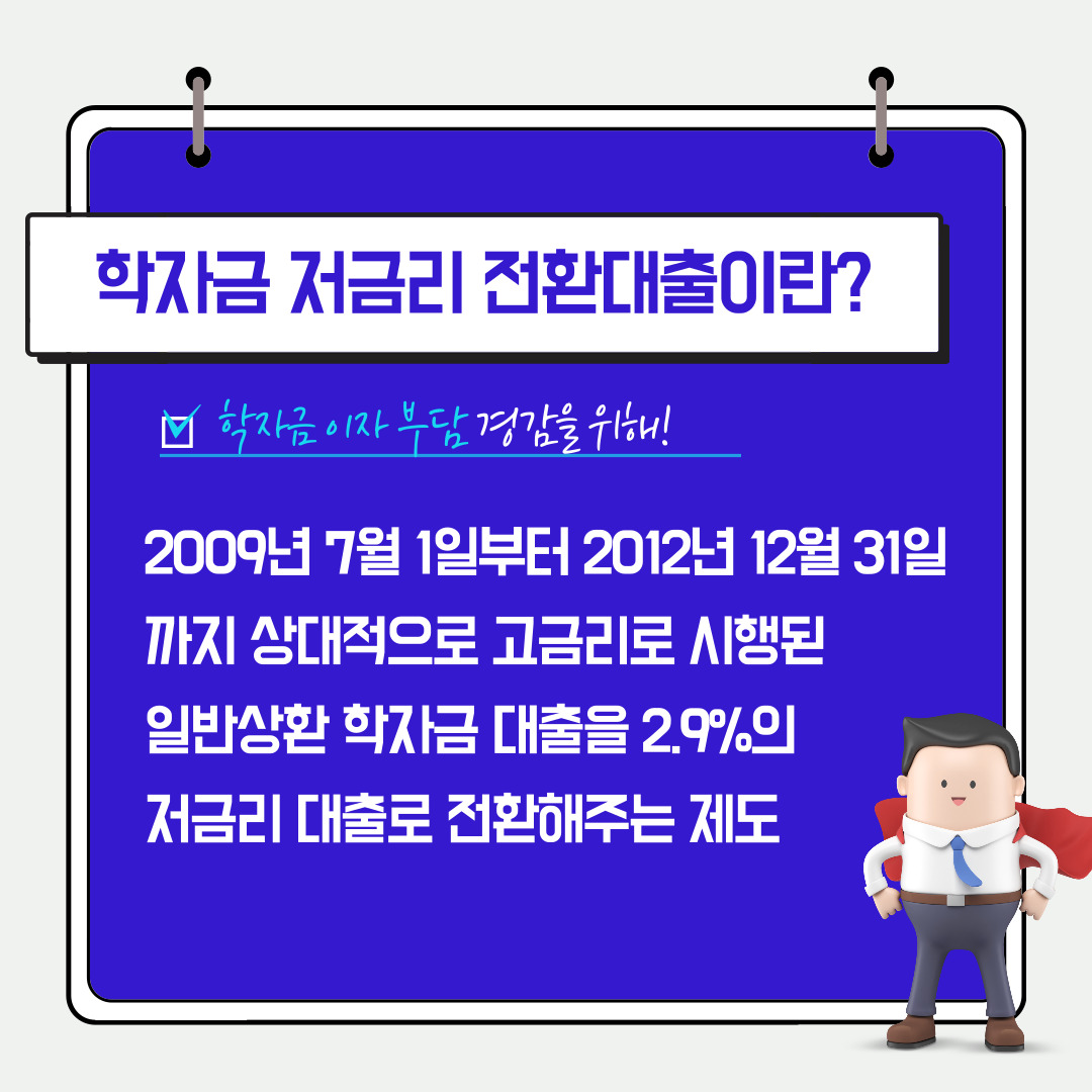 저금리 전환대출은 2009년 7월 1일부터 2012년 12월 31일까지 상대적으로 3.9%~5.8%의 고금리로 시행된 일반상환 학자금 대출을 2.9%의 저금리 대출로 전환해주는 제도입니다.