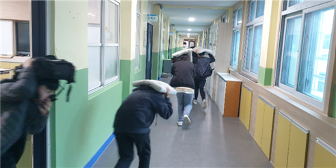 먼저, 충남 예산 조림초등학교에서는 지난 1일 오후 2시부터 지진, 화재 대피 훈련을 실시했습니다. 학생들은 지진 발생 안내방송에 따라 책상 밑으로 들어가 머리를 보호했고, 지진 뒤 이어진 화재 발생 상황에서는 방석, 가방 등으로 머리를 보호하며 입과 코를 가린 채 운동장으로 신속히 대피했습니다. 실제 재난 상황과 동일하게 훈련을 실시했습니다.