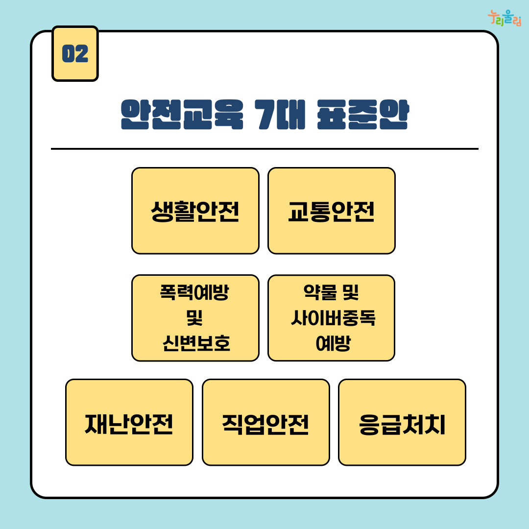 또한, 학교 현장에서 학생의 발달단계에 맞춰 체계적인 안전교육이 가능하도록 정부부처, 공공기관 및 민간기구 등에서 개발하고 제작한 안전교육 정보와 콘텐츠를 안전교육 7대 표준안에 맞추어 제공합니다. 그럼, 안전교육 7대 표준안은 무엇일까요?