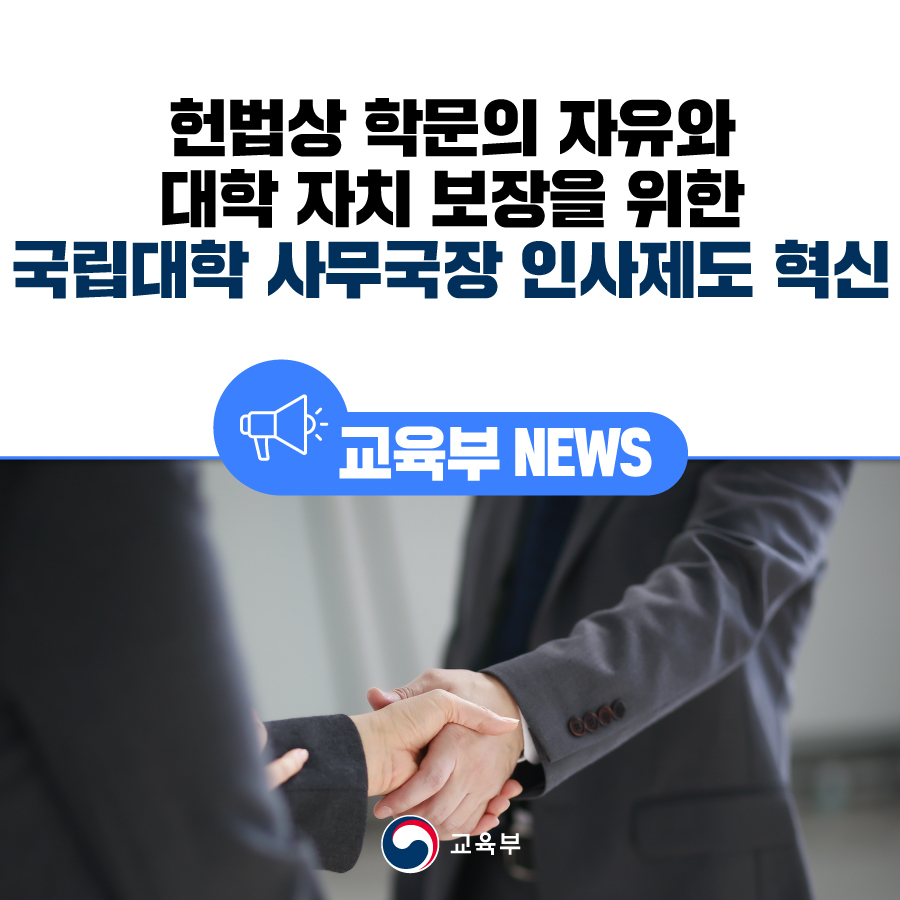 교육부는 그동안의 관료·규제 중심의 대학 운영을 혁신하고 총장의 사무국장 임용권을 완전히 보장하기 위하여 국립대학 사무국장 직위를 일반직공무원에서 ‘교수 및 민간’에 개방하였다. 또한, 총장이 원하는 인재를 사무국장으로 임용할 수 있도록 국립대학 현장의 의견을 수렴하고, 관계부처와의 긴밀한 협의 절차를 거쳐 관련 법령을 정비하였다.