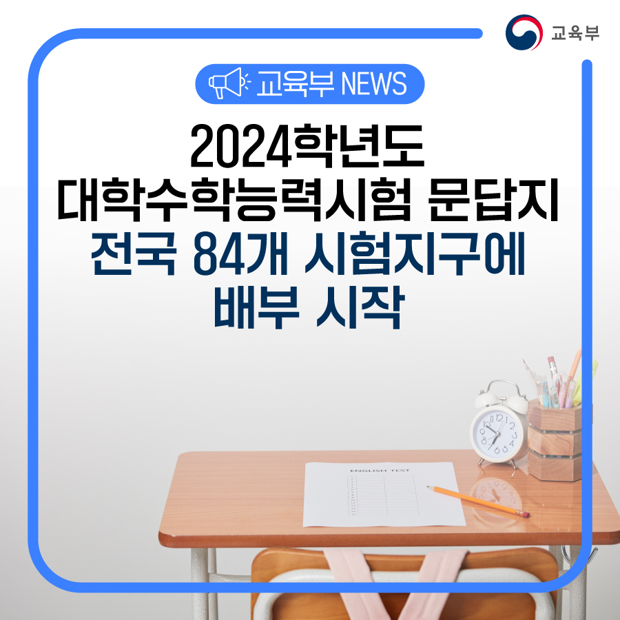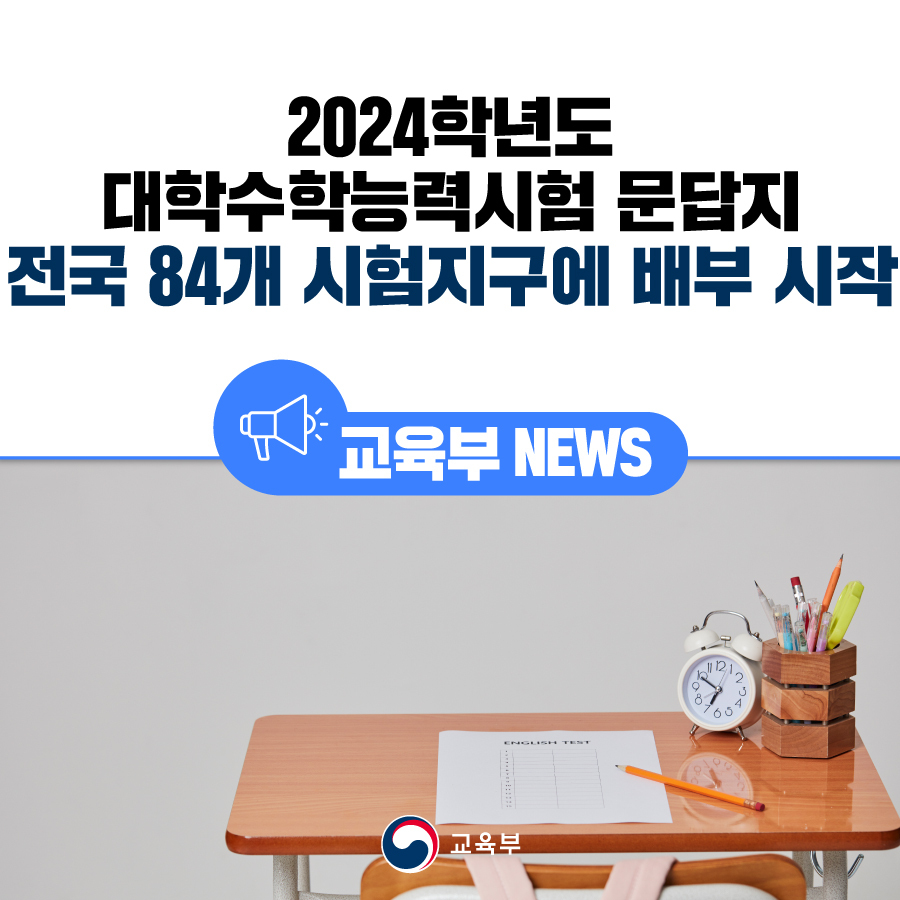 교육부(부총리 겸 교육부장관 이주호)는 11월 13일(월)부터 11월 15일(수)까지 2024학년도 대학수학능력시험 문제지와 답안지를 전국 84개 시험지구에 배부한다.