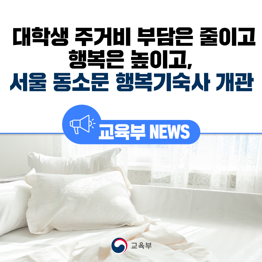 2023년 5월에 준공*된 동소문 행복기숙사(연합)는 대학생들의 거주환경 개선 및 주거비 부담 완화를 위해 교육부가 무상 제공한 국유지에 주택도시기금(국토부) 등을 포함한 사학진흥기금 총 399억 원으로 건립되었다.