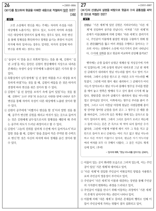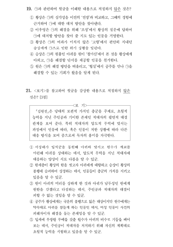 ‘『노자』에 대한 학자들의 해석’을 소재로 한 12∼17번 문항은 ‘『노자』에 대한 한비자의 해석’을 다룬 (가) 글과 ‘『노자』에 대한 다양한 유학자들의 해석’을 다룬 (나) 글을 지문으로 제시하였다. 이러한 지문 구성을 통해 공통된 화제에 대한 여러 관점들을 비교・대조하며 읽고, 독서의 결과를 비판적・창의적으로 재구성하는 능력이 있는지 측정하고자 하였다. 김종길의 ‘문’, 정끝별의 ‘가지가 담을 넘을 때’, 유한준의 ‘잊음을 논함’을 엮은 22∼27번 문항은 현대시와 고전 수필을 함께 제시하여, 내용 및 표현상의 연관성이 있는 작품들을 종합적으로 감상할 수 있는지 측정하고자 하였다.