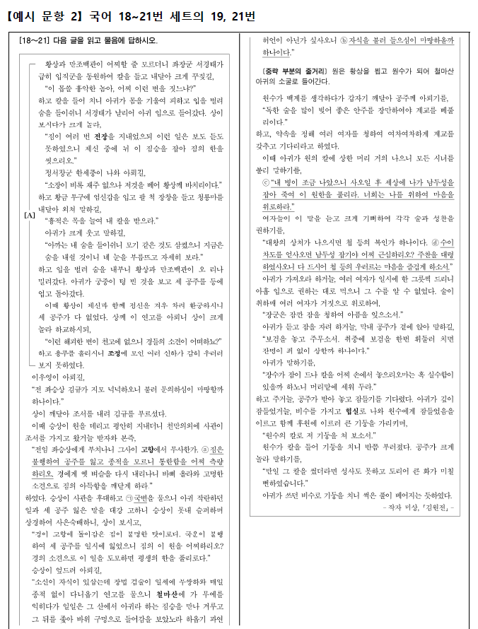 국어 영역은 ‘독서’, ‘문학’, ‘화법과 작문’, ‘언어와 매체’ 등 출제 과목별 교육 과정에서 제시한 목표와 내용을 바탕으로 하여 출제하되, 폭넓고 다양한 국어 능력을 평가하기 위해 다양한 소재의 지문과 자료를 활용하여 출제하였다. 또한 지문의 소재를 특정 분야로 제한하지 않고 교육적으로 가치 있는 소재를 두루 취하였다.