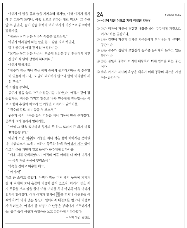 ‘화법’의 경우 ‘화법과 작문’ 중 화법 교육과정에서 제시하고 있는 ‘화법의 본질, 화법의 원리와 실제, 화법의 태도’를 평가 목표로 하여 5개 문항을 출제하였다. ‘눈을 개폐하는 물고기에 대한 발표’를 제재로 한 문항(35∼37번), ‘전통 한지의 계승·발전 방안에 대한 대화’를 제재로 한 문항(38∼39번)을 출제하였다.