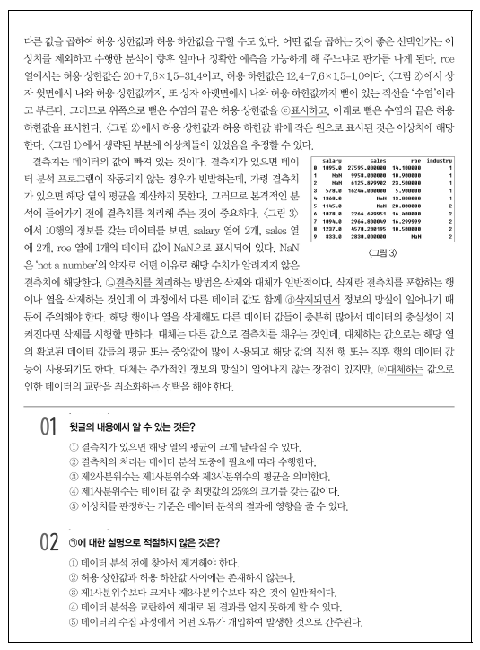하위 내용 영역별 문항의 특징을 살펴보면 다음과 같다. ‘독서’의 경우 독서 교육과정에서 제시하고 있는 ‘독서의 본질, 독서의 방법, 독서의 분야, 독서의 태도’를 평가 목표로 하여 17개 문항을 출제하였다. ‘읽기 과정에서 초인지의 역할’을 소재로 한 독서 이론 지문(1∼3번), ‘경마식 보도의 특성과 보완 방안’을 소재로 한 사회 지문(4∼7번), ‘데이터에서 결측치와 이상치의 처리 방법’을 소재로 한 과학・기술 지문(8∼11번), ‘『노자』에 대한 학자들의 해석’을 소재로 한 인문 지문(12∼17번) 등 다양한 분야의 소재들을 활용하여 문항을 출제하였다.