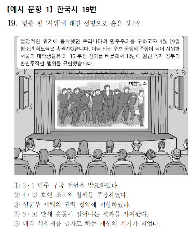 한국사 영역에서는 역사 지식의 이해, 연대기적 사고, 역사 상황 및 쟁점의 인식, 역사 탐구의 설계 및 수행, 역사 자료의 분석 및 해석, 역사적 상상 및 판단 등의 평가 요소를 측정할 수 있는 문항을 출제하였다. 청동기 시대에 대한 역사 지식의 이해(1번), 7.4 남북 공동 성명의 전후 사실에 대한 연대기적 이해(20번), 대한인 국민회에 대한 역사적 상황이나 쟁점에 대한 인식(13번), 형평 운동에 대한 역사적 탐구의 설계 및 수행 능력(12번), 조선 정조에 대한 사료를 분석하고 해석하는 능력(6번), 보안회에 대한 역사적 상상력이나 상황 판단(11번) 등 다양한 유형의 문항들을 출제하고자 노력하였다.