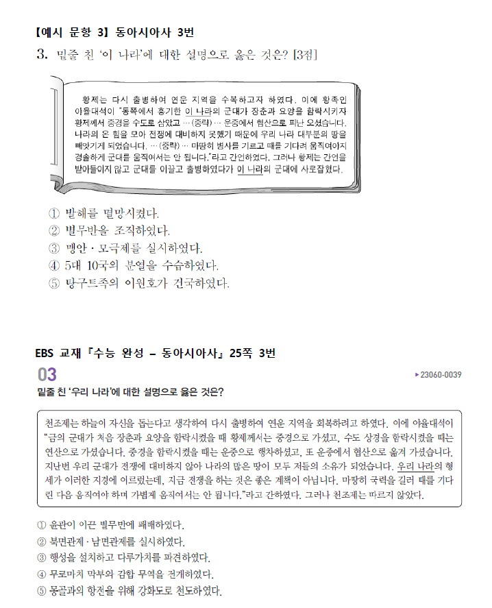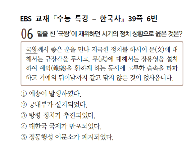 한국사 영역에서 연계하여 출제된 문항을 EBS 연계 교재와 비교하여 제시하면 다음과 같다.
