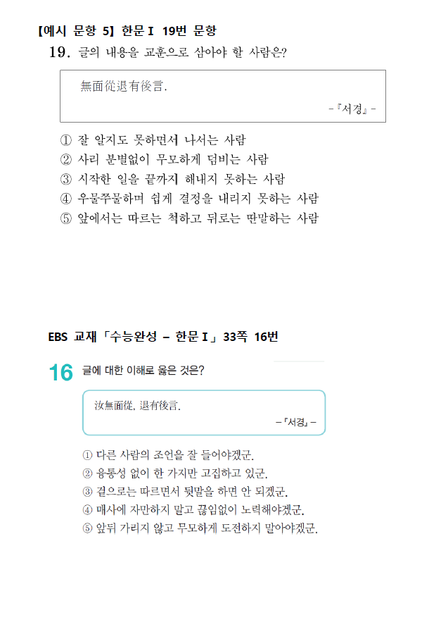 지문과 소재의 범위는 현행 13종의 고등학교 ‘한문Ⅰ’ 교과서에서 다루고 있는 내용을 위주로 하고, 일부 소재의 경우 언어생활 및 한자 문화권의 문화와 관련된 내용을 활용하였다. 그리고 한문의 이해와 한문의 활용 영역이 고르게 포함되도록 균형 있게 출제하였다.