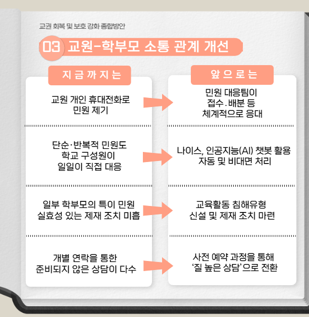 이 중 가장 눈에 띈 내용은 교원 개인이 아닌 기관 차원에서 대응하도록 체계적으로 개선한다는 점이었습니다. 2024년부터 인공지능(AI) 챗봇을 도입해 단순·반복적인 민원은 효율적으로 처리하고, 지능형 나이스 시스템을 활용한 온라인 민원시스템을 도입할 예정이라고 합니다.