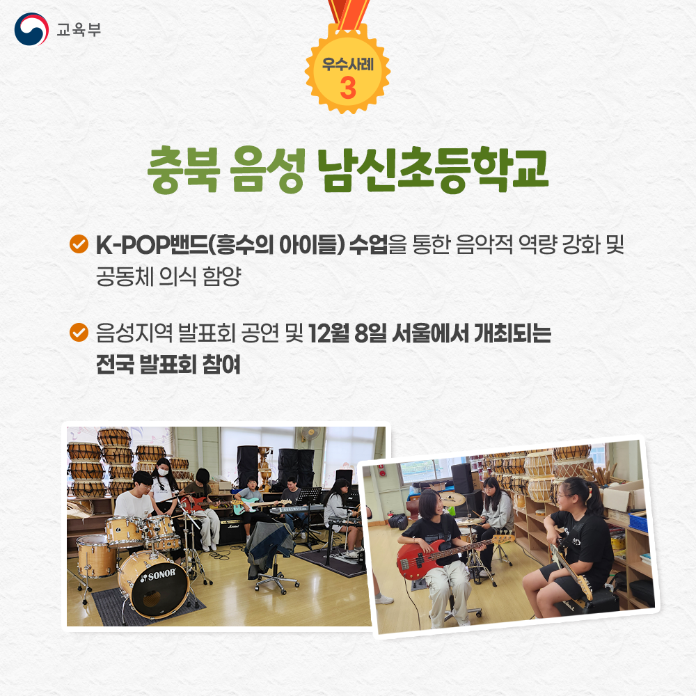 - K-POP밴드(흥수의 아이들) 수업을 통한 음악적 역량 강화 및 공동체 의식 함양