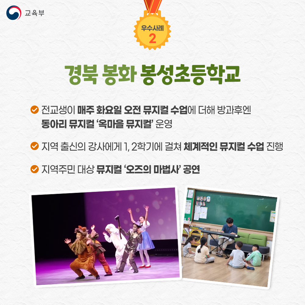 - 전교생이 매주 화요일 오전 뮤지컬 수업에 더해 방과후엔 동아리 뮤지컬 '옥마을 뮤지컬' 운영
