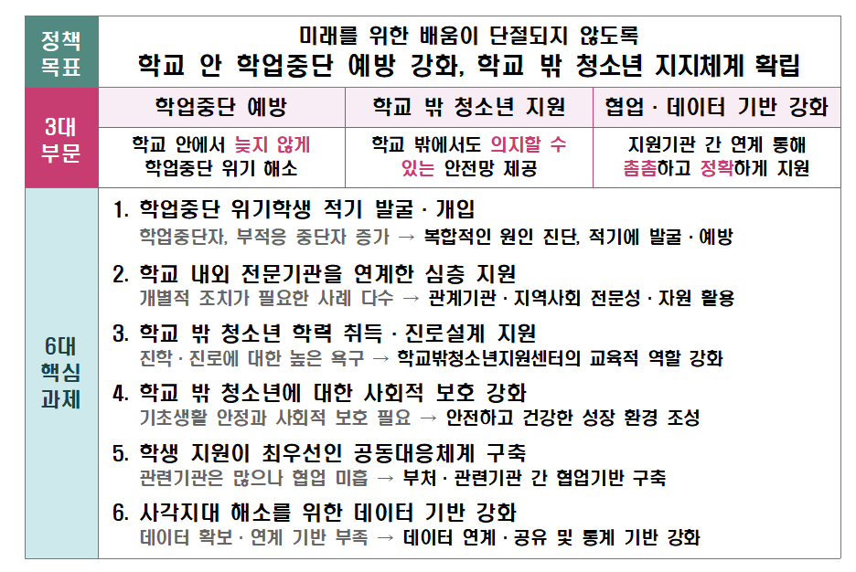 활동 방안은 ▲학업중단 예방, ▲학교 밖 청소년 지원, ▲협업·데이터 기반 강화의 3대 부문 6대 핵심과제로 구성되며, 과제별 주요 내용은 다음과 같다.