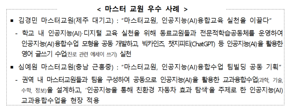 ※ 2023년 주요 성과 : 마스터교원 846명 / 리더교원 1,500명 양성, 교원 인공지능(AI)‧디지털 역량측정 도구(3종) 및 교수학습모형(5과목) 등 개발‧보급, 교원 대상 인공지능(AI)‧디지털소양 원격연수 실시(11.29.기준 10,678명 이수 中) 등