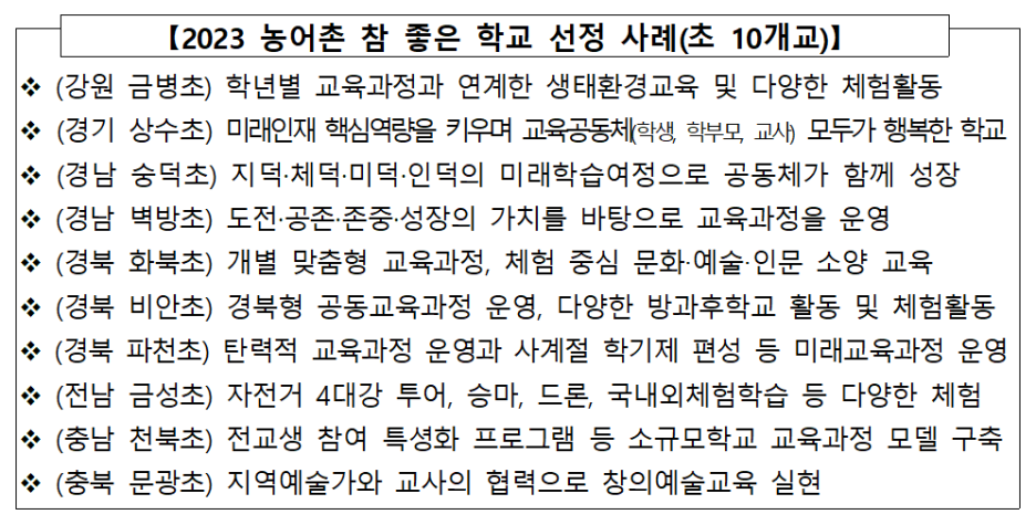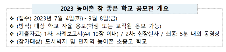 2020년부터 개최된 ‘2023 농어촌 참 좋은 학교 공모전’은 농어촌 소규모 학교가 지역 특성에 맞는 특색 있는 교육과정을 운영하거나 지속 가능한 농어촌 학교를 구현한 사례를 발굴하고 이를 확산하기 위해 마련되었다.