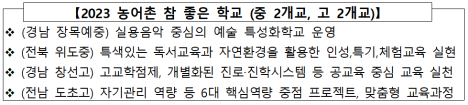 - 초등학교 10개교, 중학교 2개교, 고등학교 2개교 총 14개 학교 ‘2023 농어촌 참 좋은 학교’ 선정