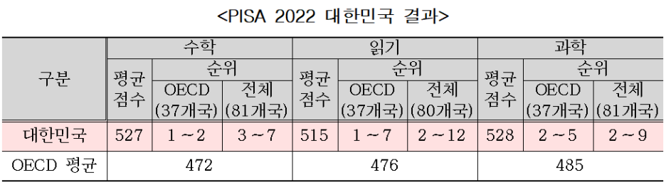 국제 학업성취도 평가(PISA) 2022에서 우리나라의 주요 결과는 다음과 같다.
