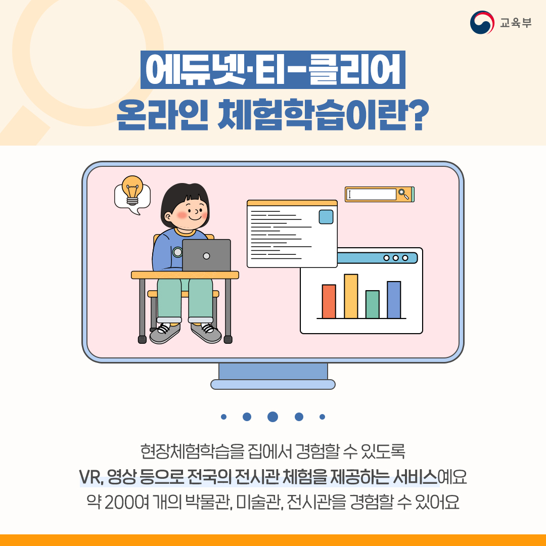 현장체험학습을 집에서 경험할 수 있도록 VR, 영상 등으로 전국의 전시관 체험을 제공하는 서비스예요. 약 200여 개의 박물관, 미술관, 전시관을 경험할 수 있어요.