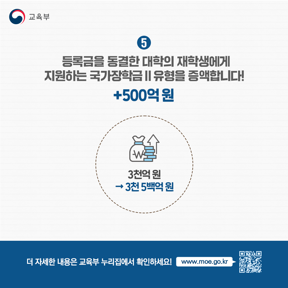 등록금을 동결한 대학의 재학생에게 지원하는 국가장학금Ⅱ유형을 증액합니다! +500억 원