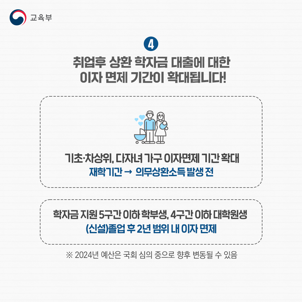 - 기초 ㆍ차상위, 다자녀 가구 이자면제 기간 확대 : 재학기간 > 의무상환소득 발생 전