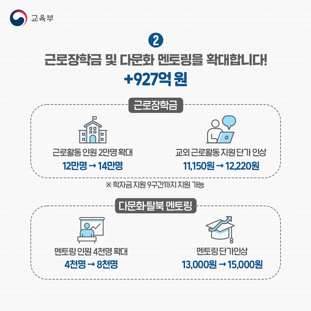 근로장학금 및 다문화 멘토링을 확대합니다! +927억 원