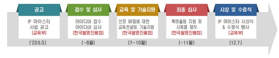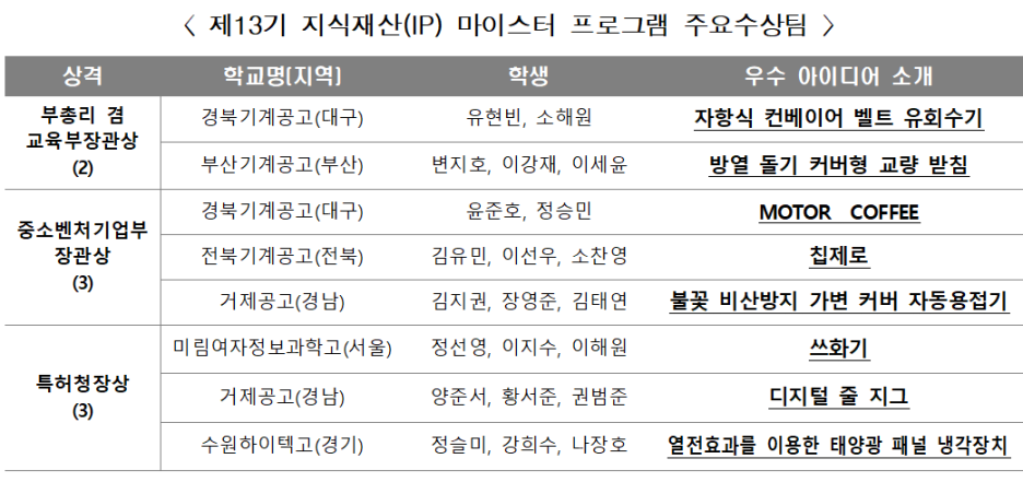 ※ IP(Intellectual Property) 마이스터 프로그램: 직업계고 학생들의 지식재산권(특허) 출원 및 기술이전 등을 지원해 문제해결 역량을 갖춘 인재로 성장을 지원하는 사업(2011년~)