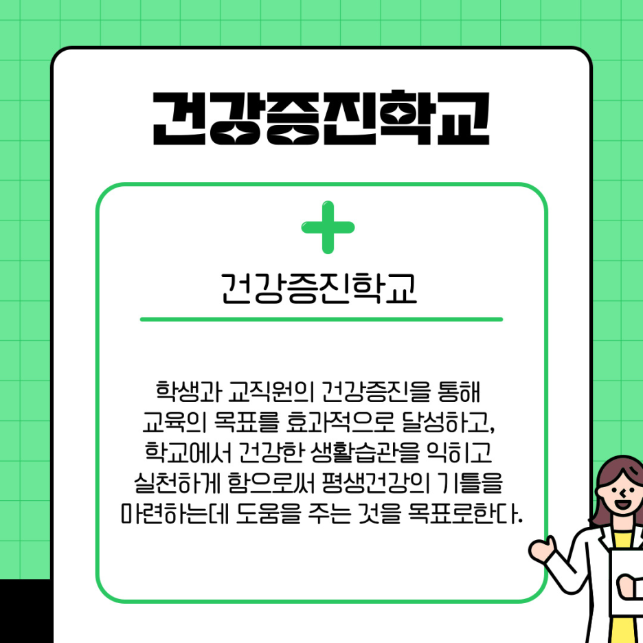 다양한 정보 중 저는 첫 번째로 건강증진학교를 살펴봤는데요. 학교에서 건강한 생활습관을 익히고 실천하며 학생과 교직원의 건강을 증진하고 평생건강의 기틀을 마련하는 것을 목표로 한 건강증진학교는 2009년 시범사업으로 16개교에서 시행되었고, 현재까지도 확대되어 운영하고 있습니다.
