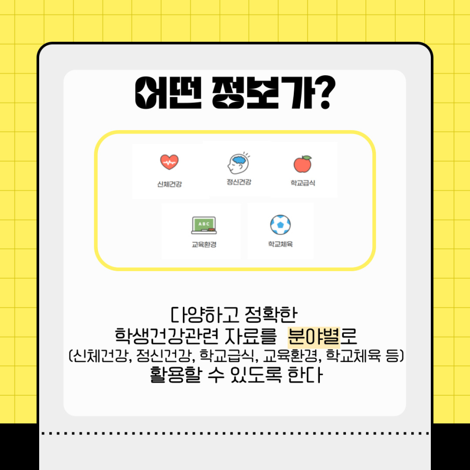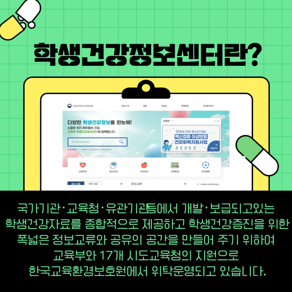 학생 건강의 중요성이 부각되는 요즘, 학생들에게 건강한 생활 습관을 전하는 것이 무척 중요한데요. 그래서 오늘은 학생 건강자료를 제공하고 건강증진을 위한 정보를 찾고, 공유할 수 있는 공간인 학생건강정보센터를 소개하겠습니다.