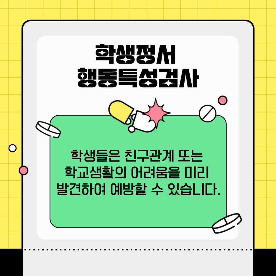 두 번째로 학생정서·행동특성검사를 살펴봤습니다. 검사를 하기 위한 방법부터 교육자료 등 다양한 정보들을 확인할 수 있었는데요. 학생정서·행동특성검사를 통해 학생들은 본인의 정서와 행동에 대해 알 수 있고, 친구관계 또는 학교생활의 어려움을 미리 발견해 예방할 수 있다고 합니다. 검사는 학교 사정에 따라 다르니 학생건강정보센터 누리집에서 확인해주세요.