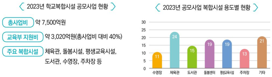 2023년에는 학생·지역주민에게 다양한 예체능 프로그램과 수준 높은 평생교육을 제공할 목적으로 학교복합시설 공모사업 39개를 선정하였다. 39개 공모사업의 총 사업비는 7,500억 원 수준으로 교육부에서 3,020억 원을 지원하고 관계부처 국고지원 사업을 통해 427억* 원을 지원하여 지자체‧교육청의 재정 부담을 줄여주었다.