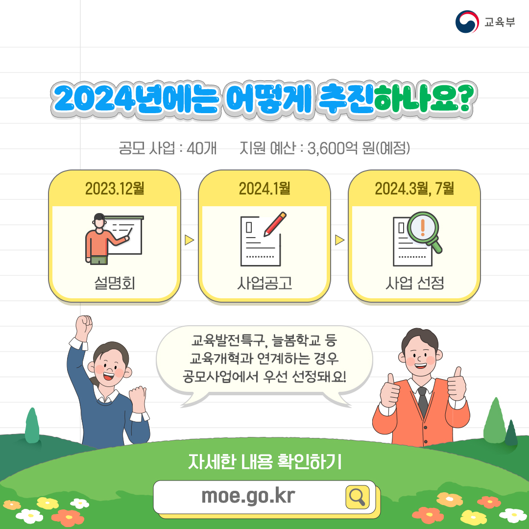 "교육발전특구, 늘봄학교 등 교육개혁과 연계하는 경우 공모사업에서 우선 선정돼요!"