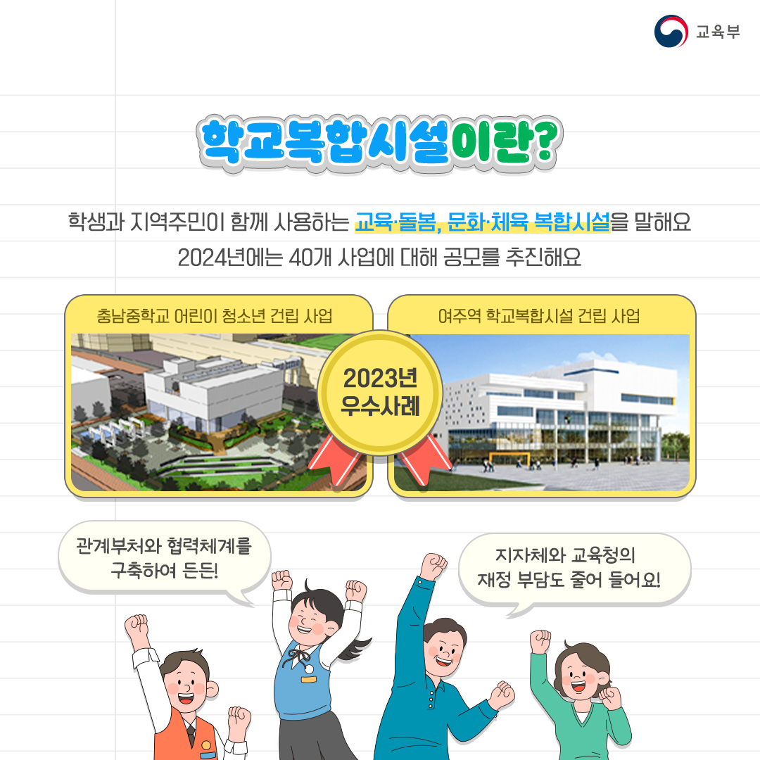 학생과 지역주민이 함께 사용하는 교육ㆍ돌봄, 문화ㆍ체육 복합시설을 말해요. 2024년에는 40개 사업에 대해 공모를 추진해요!