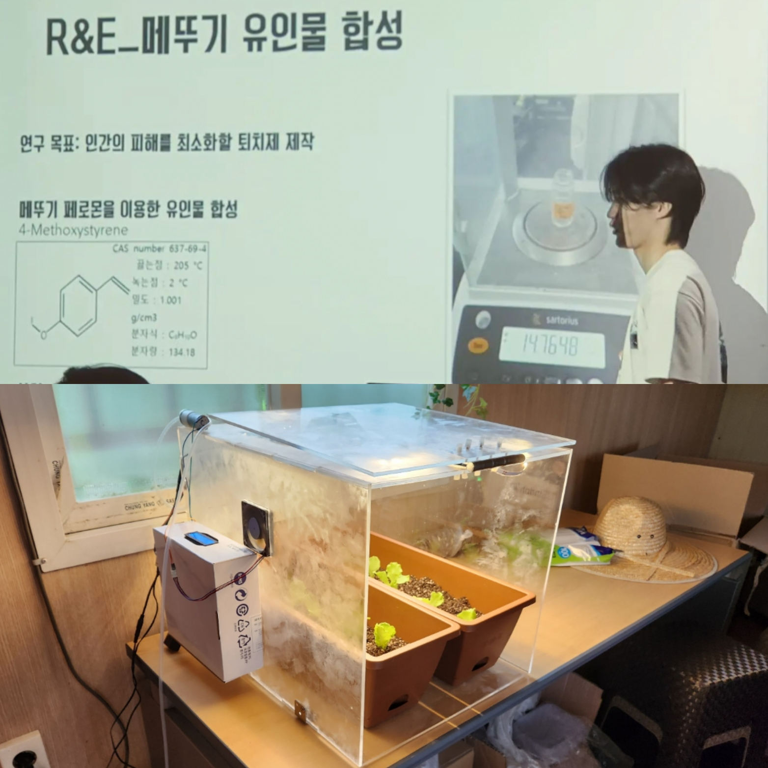 작물을 재배하며 해충에 대한 문제가 많았다고 하는데요. 학생들은 향기, 냄새에서 아이디어를 얻어 3가지 방법으로 해충 문제를 해결했다고 합니다. 첫 번째로 허브류 식물심기, 두 번째로는 에틸포메이트 화학물을 직접 합성해 자연스럽게 기화하며 병충해 예방하기, 마지막으로는 수컷 곤충이 암컷 곤충의 페로몬을 감지하여 짝짓기하는 특성에 아이디어를 얻어 페로몬을 이용한 트랩을 해충을 유인하고 방지하는 방안을 세웠습니다.