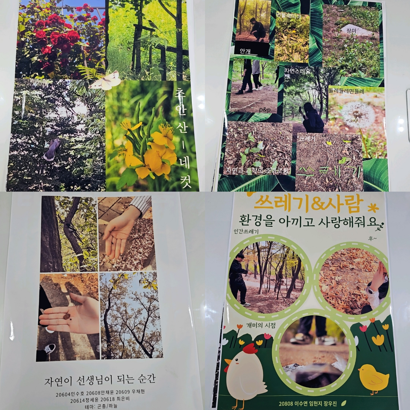 이렇게 환경교육은 교내외에서도 진행이 되는데요. 박소영 학생은 “산에 오르면서 평소에 좋아하던 조류 사진 찍기 활동을 추가로 진행”해볼 수 있었고, 명수빈 학생은 “다른 학생들이 찍은 자연의 모습을 보며 자연의 다양한 모습에 흥미를 두었습니다.”라고 소감을 밝혔습니다. 최하영 학생은 “같은 주제라도 다른 관점에서 조화롭게 작품을 만들 수 있었다.”라고 말하며 다양한 관점을 볼 수 있었던 점을 장점으로 덧붙였습니다.