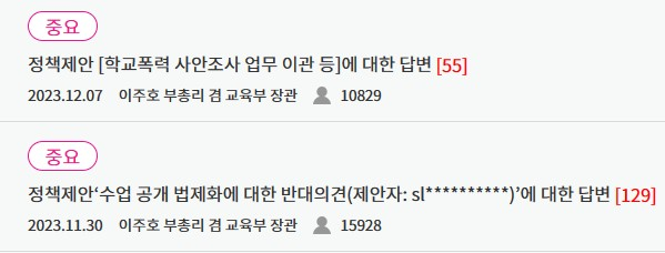 이 외에도 정책알림 게시판에서는 정책제안에 대한 답변과 교육정책 및 교육소식을 볼 수 있습니다. 최근 이주호 부총리 겸 교육부 장관이 정책제안에 대한 답변을 남겨주었습니다. 해당 답변에도 댓글 작성이 가능해 소통의 창구가 열린 것 같다며 자유롭게 소통하는 사용자들의 모습을 볼 수 있었습니다.
