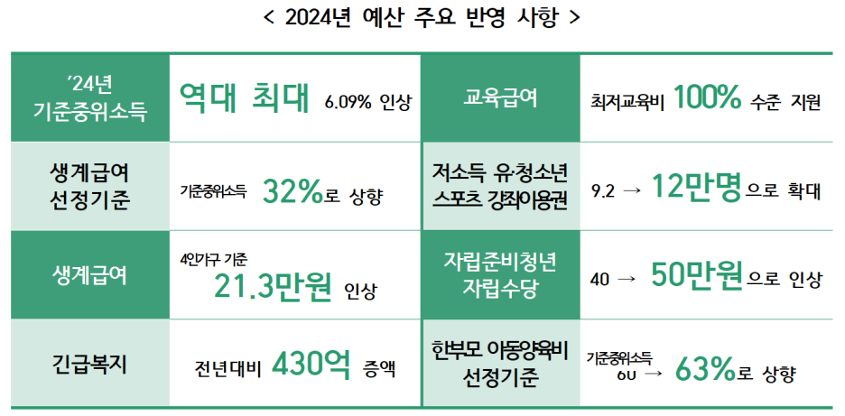 셋째, 저소득층 등 취약계층을 더욱 두텁게 지원하였다. 올해 1~9월 기준, 긴급복지 위기사유 중 복지사각지대 발굴대상 지원 건수가 전년대비 48.6% 증가하였다. 일반학교 내 특수학급을 575학급 증설하였고, 올해 10월 국내 최초의 장애예술 표준공연장인 ‘모두예술극장’을 개관하여 장애인의 교육·문화 기회를 확대하였다. 또한, 내년도 기초생활보장 생계 급여를 역대 최대 수준으로 인상하는 등 약자복지 실현을 위한 2024년 정부 예산도 크게 증액하였다.