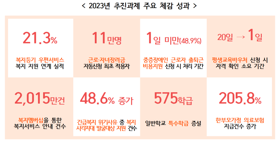점검 결과, 총 68개 과제 중 11개의 과제를 완료하였으며, 나머지 57개 과제는 모두 정상 추진 중이다. 주요 체감 성과는 다음과 같다.