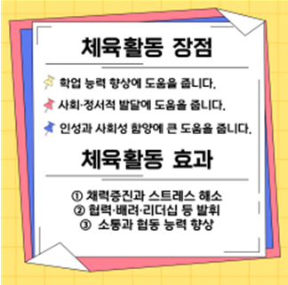 저는 이번 필통톡을 보며, 다양한 곳에서 아동과 청소년의 건강을 위해 적극적인 관심을 기울이며 지원을 아끼지 않는다는 점을 알 수 있었는데요. 다양한 체육활동을 통해 아이들이 몸도 마음도 건강한 학교생활을 할 수 있기를 바랍니다.