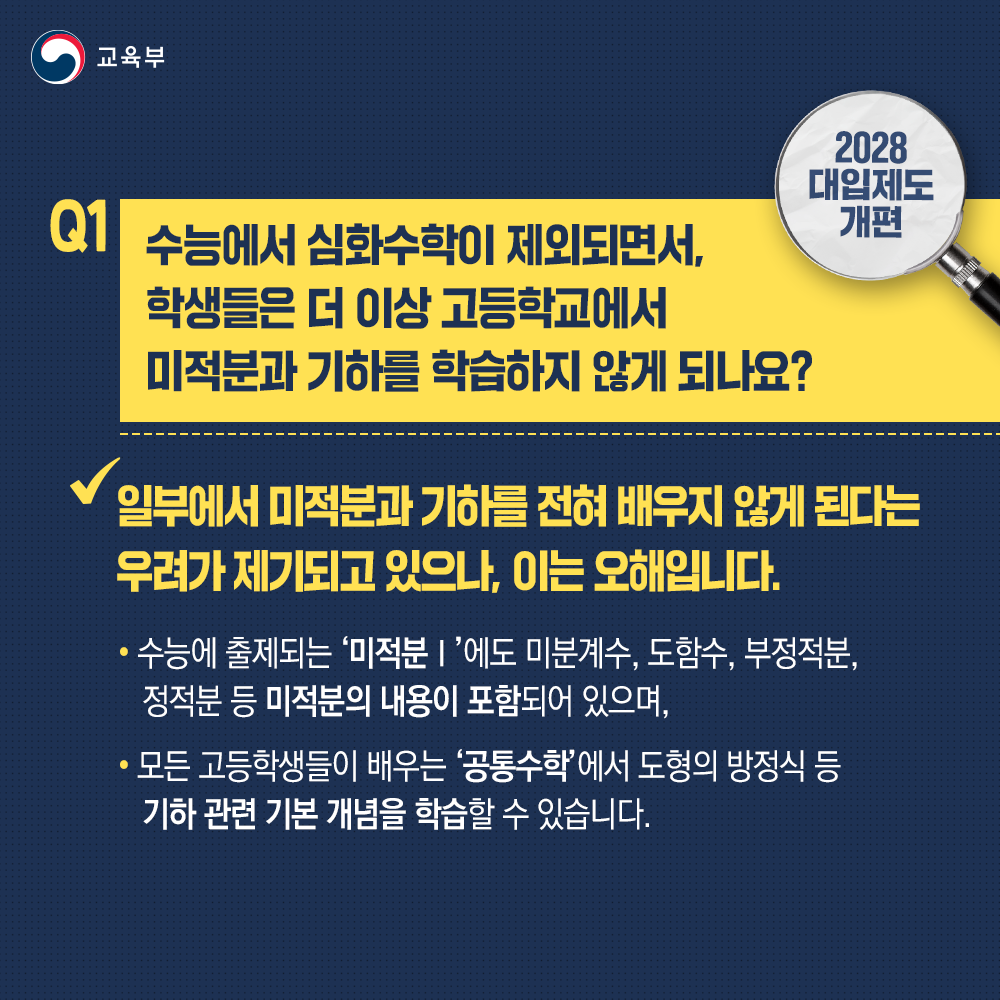 Q1. 수능에서 심화수학이 제외되면서, 학생들은 더 이상 고등학교에서 미적분과 기하를 학습하지 않게 되나요?