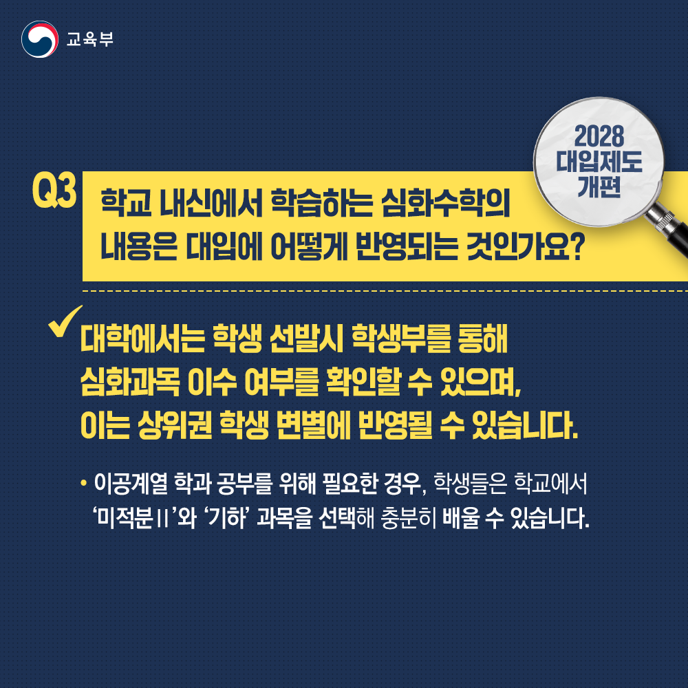 Q3. 학교 내신에서 학습하는 심화수학의 내용은 대입에 어떻게 반영되는 것인가요?