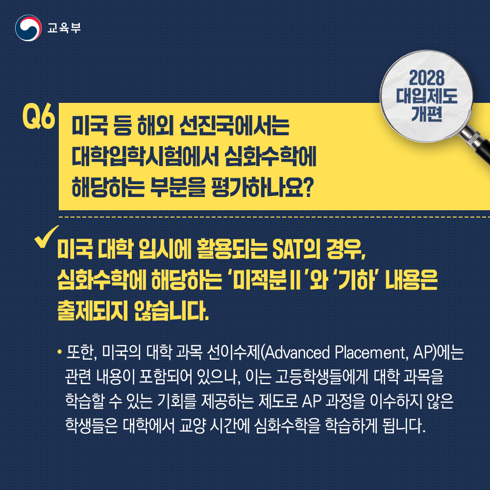 Q6. 미국 등 해외 선진국에서는 대학입학시험에서 심화수학에 해당하는 부분을 평가하나요?