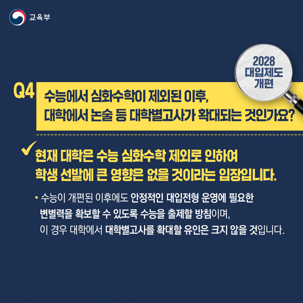 Q4. 수능에서 심화수학이 제외된 이후, 대학에서 논술 등 대학별고사가 확대되는 것인가요?