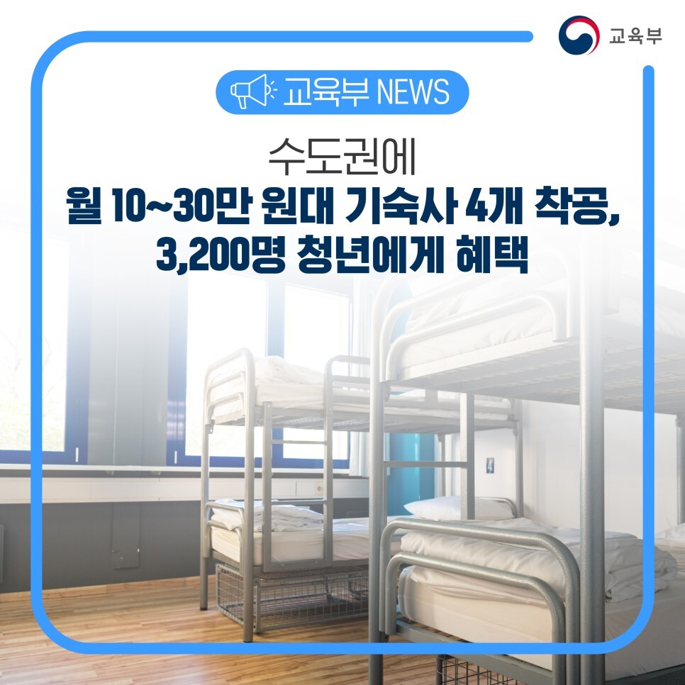 2024년에는 수도권 지역 약 3,200명의 학생들이 월 기숙사비 10만 원에서 30만 원 수준으로 이용할 수 있는 4개의 기숙사가 착공된다.