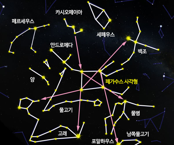 ■ 우리나라에서 볼 수 있는 가을철 별자리가을의 밤하늘에서는 봄과 마찬가지로 밝은 별을 거의 찾아볼 수 없습니다. 가을 하늘에서는 맨 먼저 커다란 사각형을 찾으면 됩니다. 이 사각형이 바로 천마 페가수스자리입니다. 페가수스자리 북동쪽으로 흐릿한 별이 두 갈래로 띄엄띄엄 이어져 있는데 이를 연결하면 페르세우스가 페가수스를 타고 안드로메다 공주를 구했다는 영웅 이야기의 주인공인 안드로메다자리와 페르세우스자리가 됩니다.