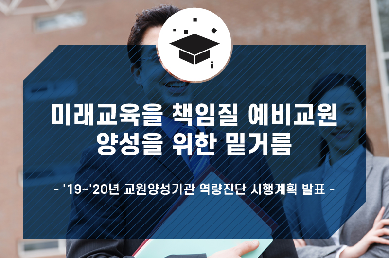 교육부(부총리 겸 교육부장관 유은혜)는 ‘19~’20년 교원양성기관 역량진단 시행계획을 수립하여 발표했습니다. 교육부는 한국의 교육을 이끌어갈 미래 교원 양성의 질적 수준을 높이기 위해 ‘98년부터 한국교육개발원에 위탁하여 교대, 사법대학 등 교원양성기관에 대한 평가를 지속적으로 추진해왔습니다.