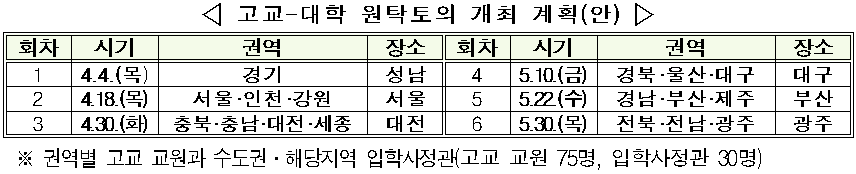 교육부(부총리 겸 교육부장관 유은혜)와 한국과학창의재단(이사장 안성진)은 17개 시‧도교육청과 함께 4월 4일(목)부터 5월 30일(목)까지 전국 6개 권역에서 ‘우리 모두의 아이로 공감하는 고교‧대학 간 원탁토의’를 개최합니다. 이번 행사는 전국 630명의 고교 교원과 입학사정관이 처음으로 함께 만나 학생의 성장을 위한 수업, 평가, 기록에 대해 이야기하는 자리로 첫 원탁토의는 경기권역에서 4월 4일(목)에 열렸습니다.